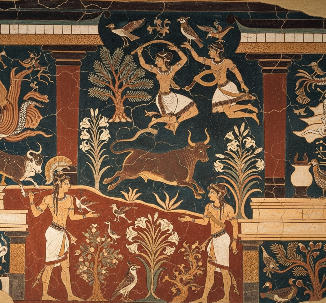 Their festivals featured bull-leaping ceremonies symbolising strength and devotion. At the city’s heart stood the grand Temple of the Mother Goddess, its walls of gold and silver gleaming, crowned with ivory roofs and golden statues beside the royal palace that overlooked the shining harbour.